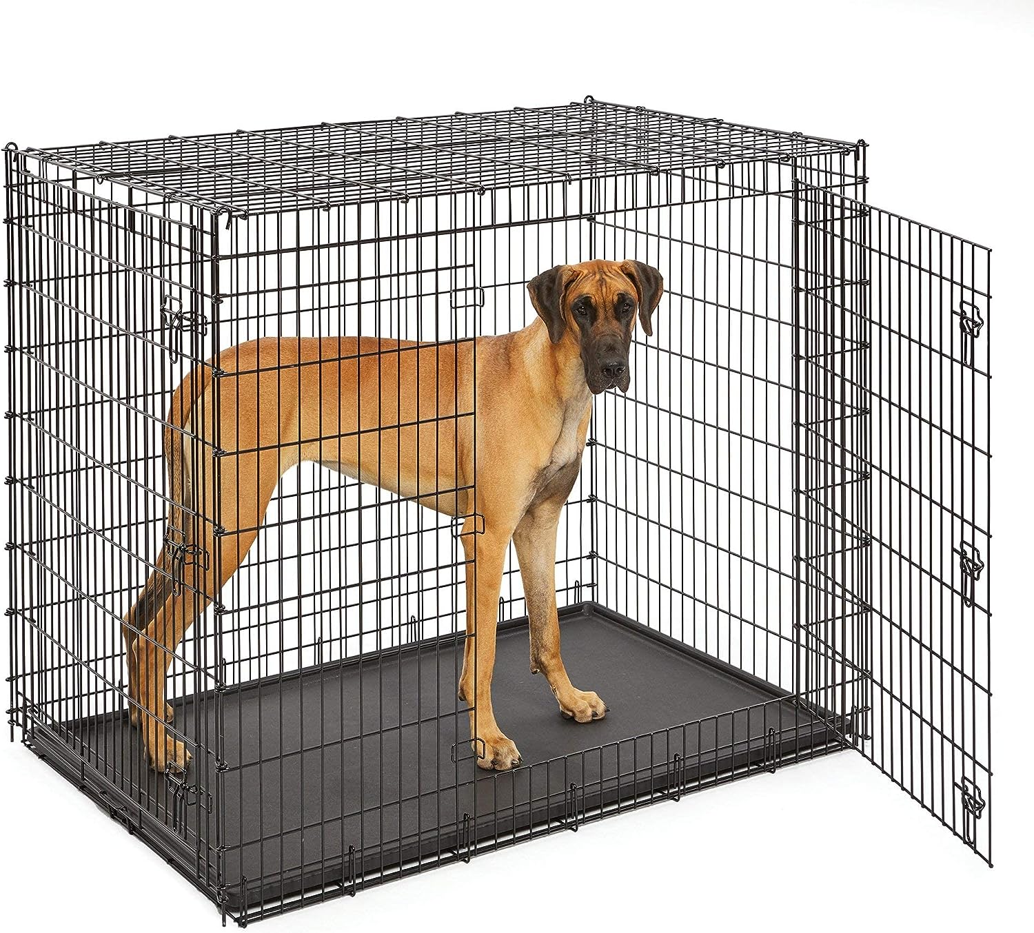 Measuring 48 x 29.6 x 31.7 inches, the iCrate is designed to accommodate extra-large dog breeds weighing between 90-110 pounds. If your dog’s weight or measurements are on the higher side for this crate, we highly recommend purchasing the next size up for optimal comfort and space.